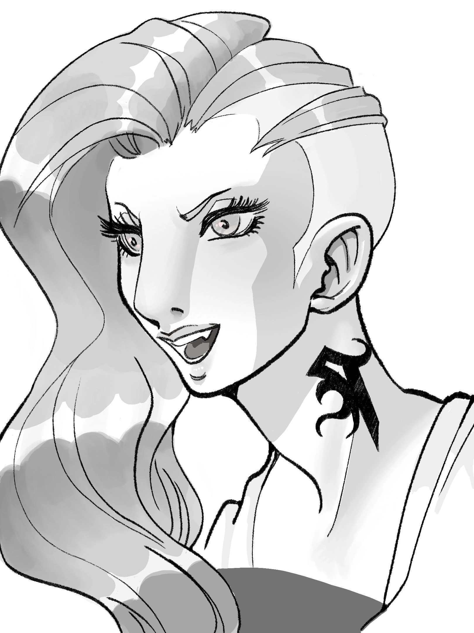 Grayscale portrait of Moenbryda, from Final Fantasy XIV A Realm Reborn! Made with Procreate.
