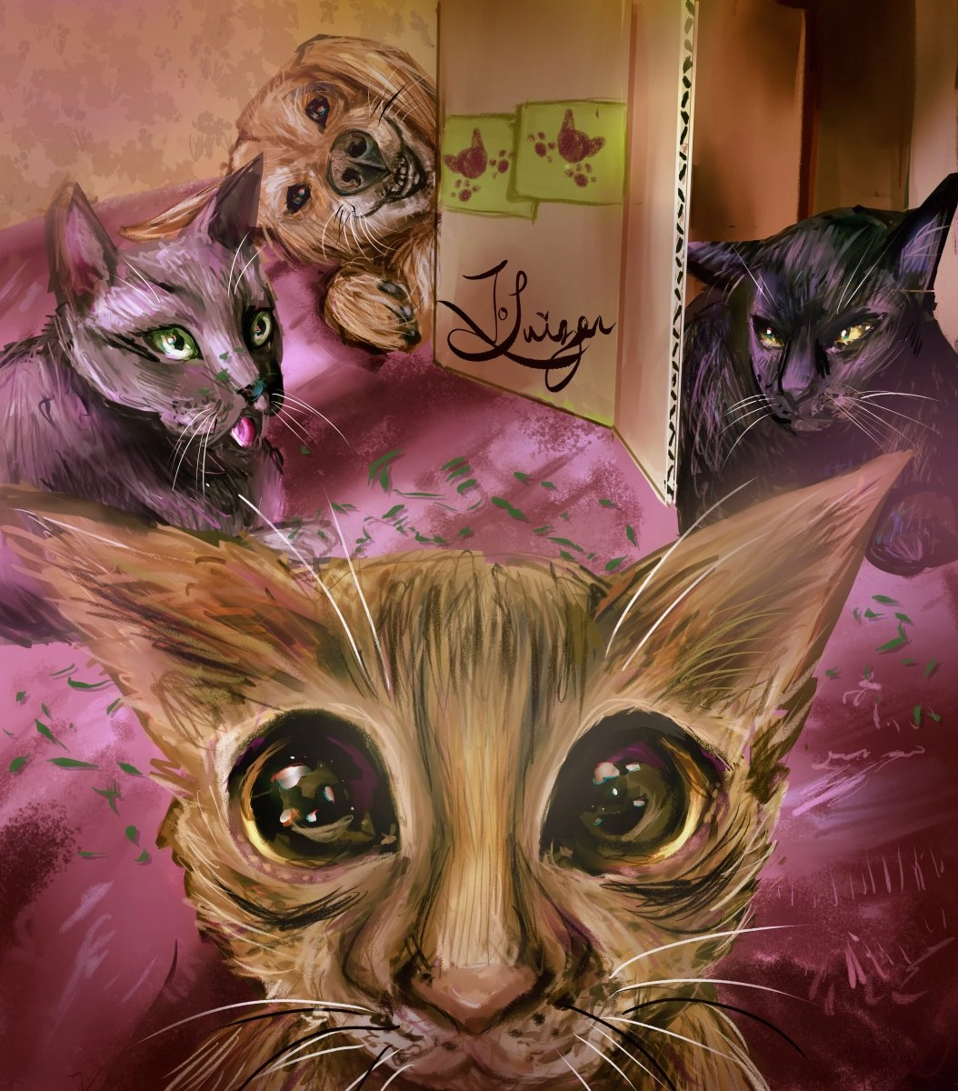 Drawtober prompt was cat so I drew my animals. Ignore my puppy he thinks he's a cat XD