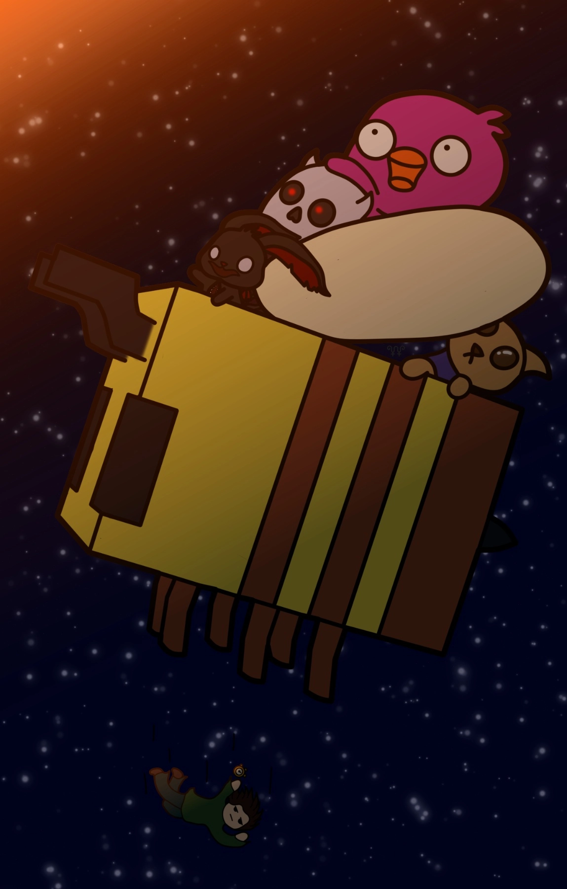 So I play Minecraft on this SMP where we accidentally figured out how to go to space on a giant bee ( people with mod privileges where involved if anyone is wondering) and I made this piece of art to commemorate the moment